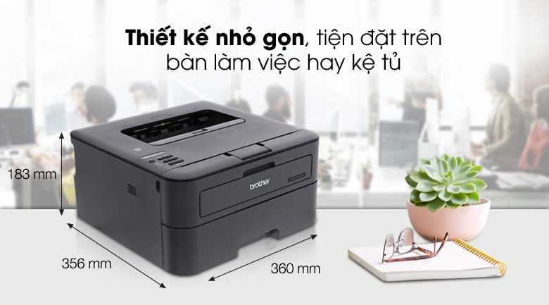 Máy in laser Brother HL-L2366DW Wifi có kiểu dáng khá nhỏ gọn, thích hợp với nhiều không gian văn phòng hay làm việc tại nhà. Ngoài ra, kết hợp cùng với gam màu đen tạo nên sự hiện đại, chắc chắn và dễ dàng vệ sinh.